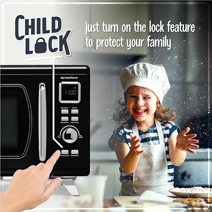 VINTAGE ACCENTS: Boost your kitchen with a classic mid-century design. This large microwave has a sleek chrome door handle, control panel, accents, and splayed feet that add fun and flair to this unique retro-styled appliance.